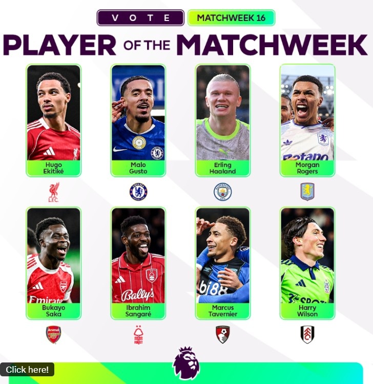 12月16日讯 英超官方公布了本轮最佳球员候选名单,其中埃基蒂克、萨卡、哈兰德等球员在列,具体如下: