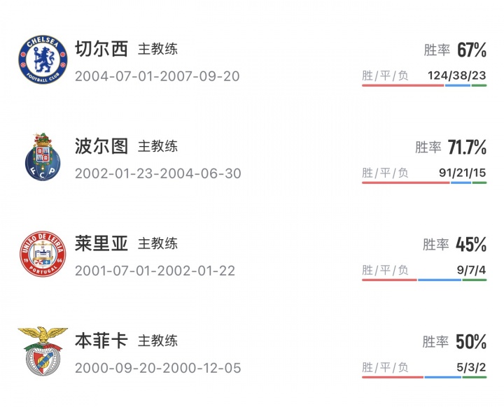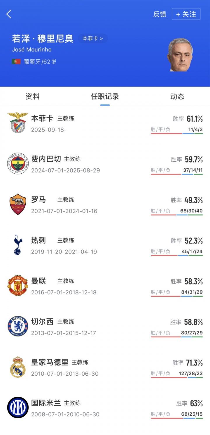 穆里尼奥现年62岁,执教生涯从葡萄牙体育起步,历任本菲卡、莱里亚、波尔图、切尔西、国米、皇马、切尔西、曼联、热刺、罗马、费内巴切主帅。