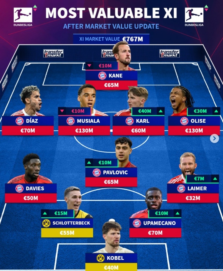 德甲身价最贵阵:穆西亚拉、奥利塞均1.3亿,拜仁9将、多特2人