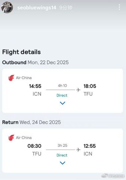 今天,博主“巴适足球”在个人微博写道:网传徐正源今天傍晚到成都,后天返回韩国。据说成都蓉城俱乐部将为他举办一个送行仪式,不知道会不会邀请球迷代表参加。根据图片信息,徐正源乘坐的航班将于今天18:05抵达天府国际机场,他后天早上08:30离开成都返回韩国。