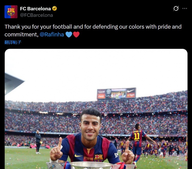 12月23日讯 32岁巴西中场拉菲尼亚自宣退役,巴萨官方发文致敬。