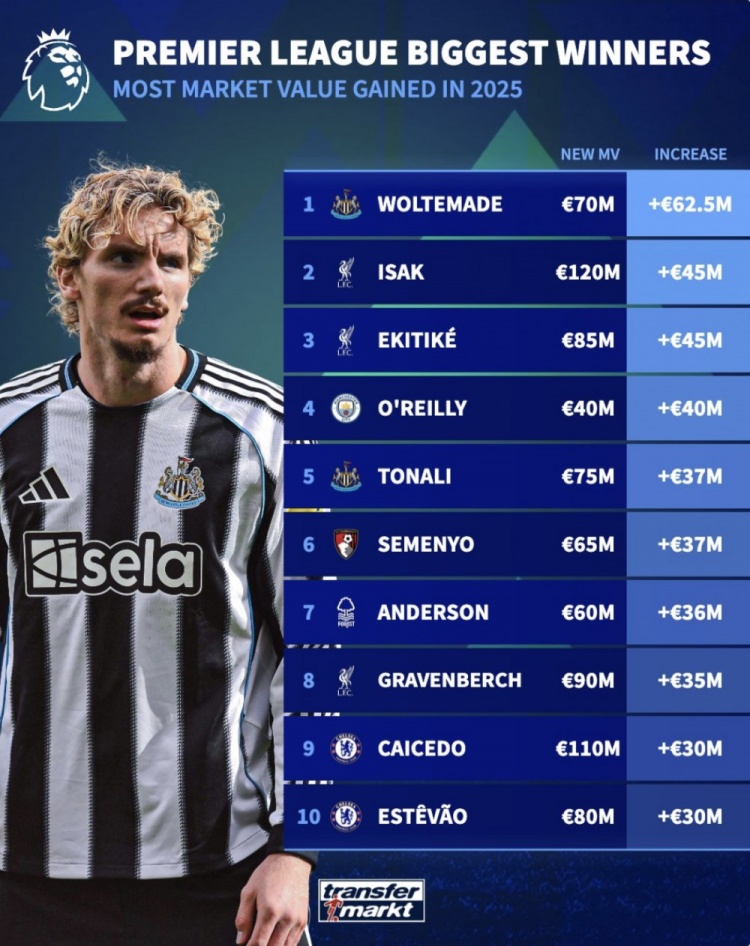 12月24日讯 德转公布2025年英超球员身价上涨排行榜单,沃尔特马德上涨6250万欧位居首位。