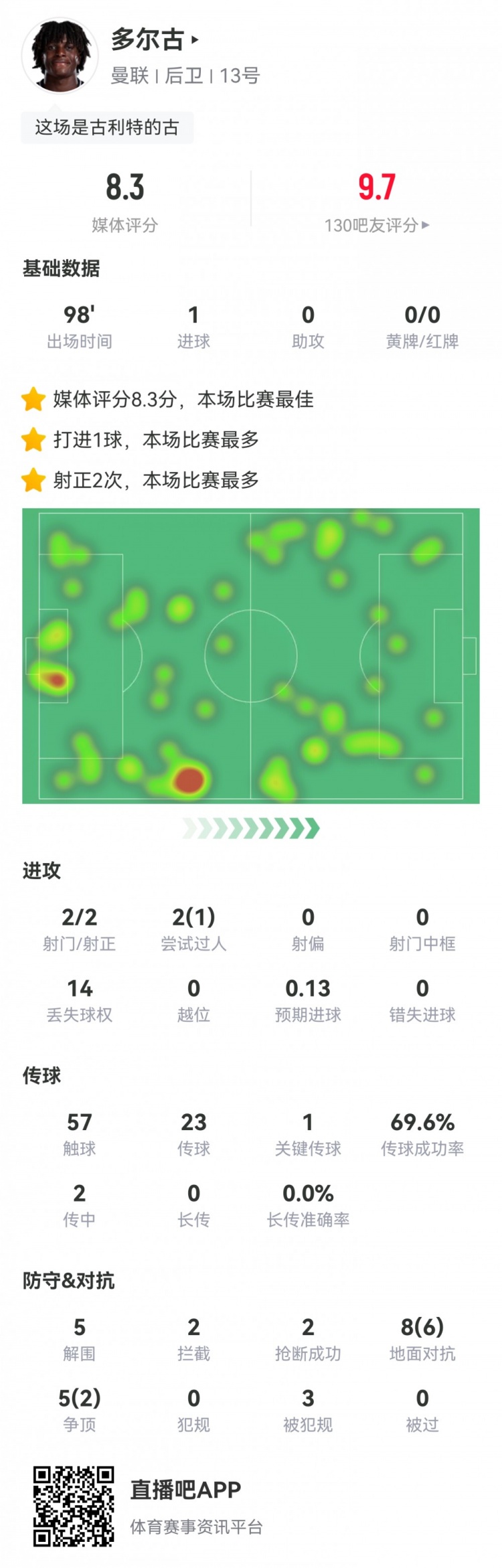 12月27日讯 本轮英超,曼联1-0纽卡。此役多尔古首发打满全场攻入制胜球,球员全场重点数据如下↓
