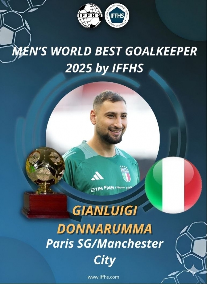 12月27日讯 IFFHS(国际足球历史和统计联合会)近日公布了2525年度最佳门将评选结果,巴黎/曼城门将多纳鲁马当选。