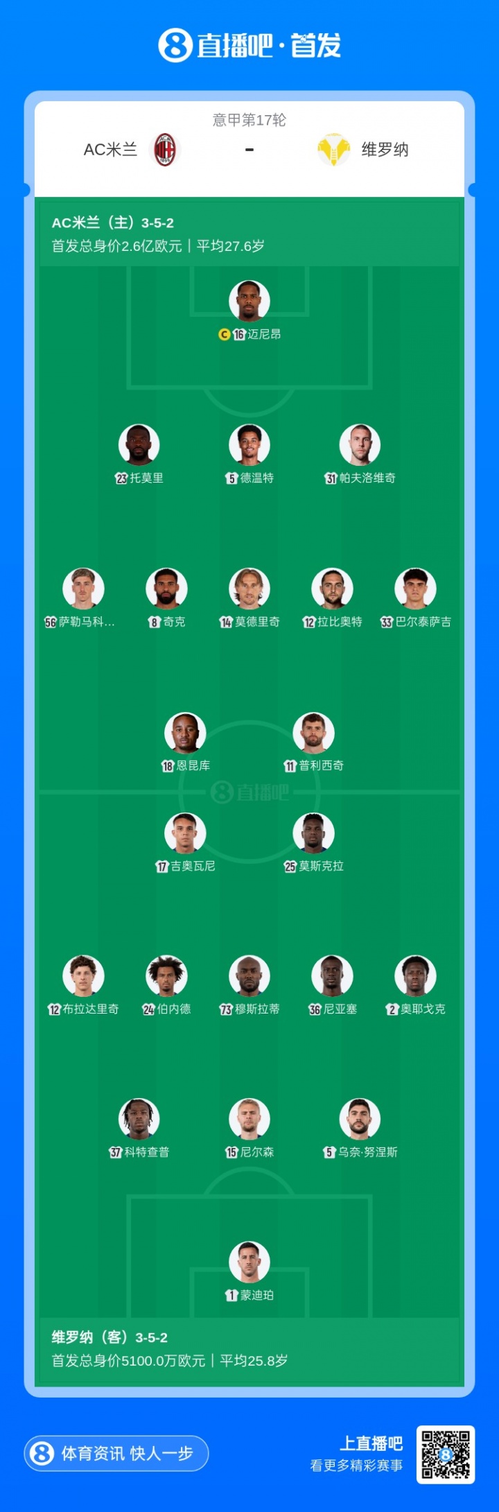 12月28日讯 北京时间今晚19点30分,意甲第17轮,AC米兰主场迎战维罗纳,赛前双方公布首发阵容。
