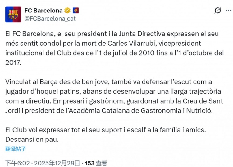 巴萨官方社媒写道:“巴塞罗那足球俱乐部、其主席及董事会,对卡莱斯·维拉鲁比的逝世表示深切哀悼。维拉鲁比2010年7月1日至2017年10月1日期间担任俱乐部机构事务副主席。