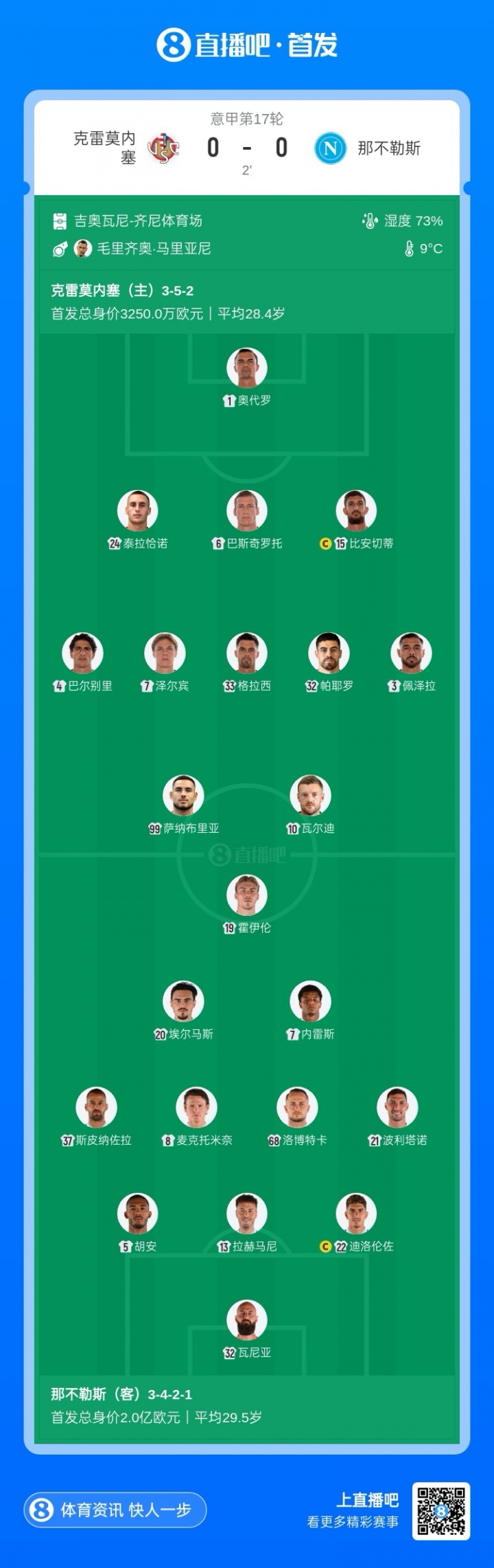 12月28日讯 北京时间今晚22点,意甲第17轮,那不勒斯客场挑战克雷莫内塞。赛前,双方首发出炉。
