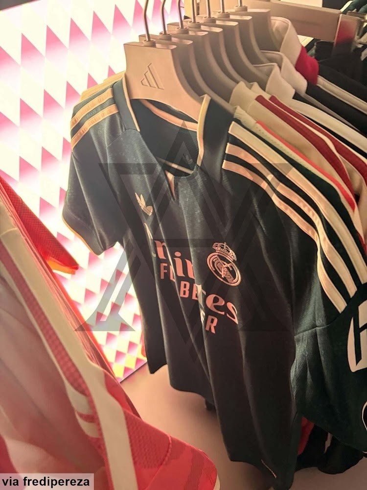 这件阿迪达斯皇马2026-27赛季客场球衣的泄露图似乎来自一家商店或发布会现场,衣架上可见多件球衣,其中也包括皇马26-27赛季的粉色第三球衣。
