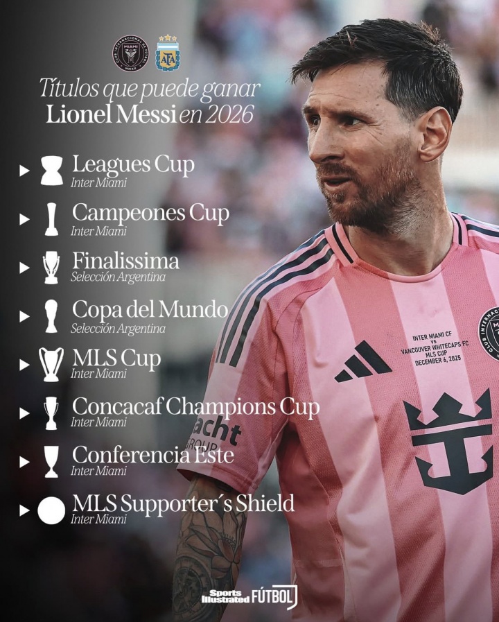 sports illustrated futbol盘点了2026年39岁梅西可以争夺的冠军头衔,其中迈阿密国际有6项,阿根廷国家队有2项。