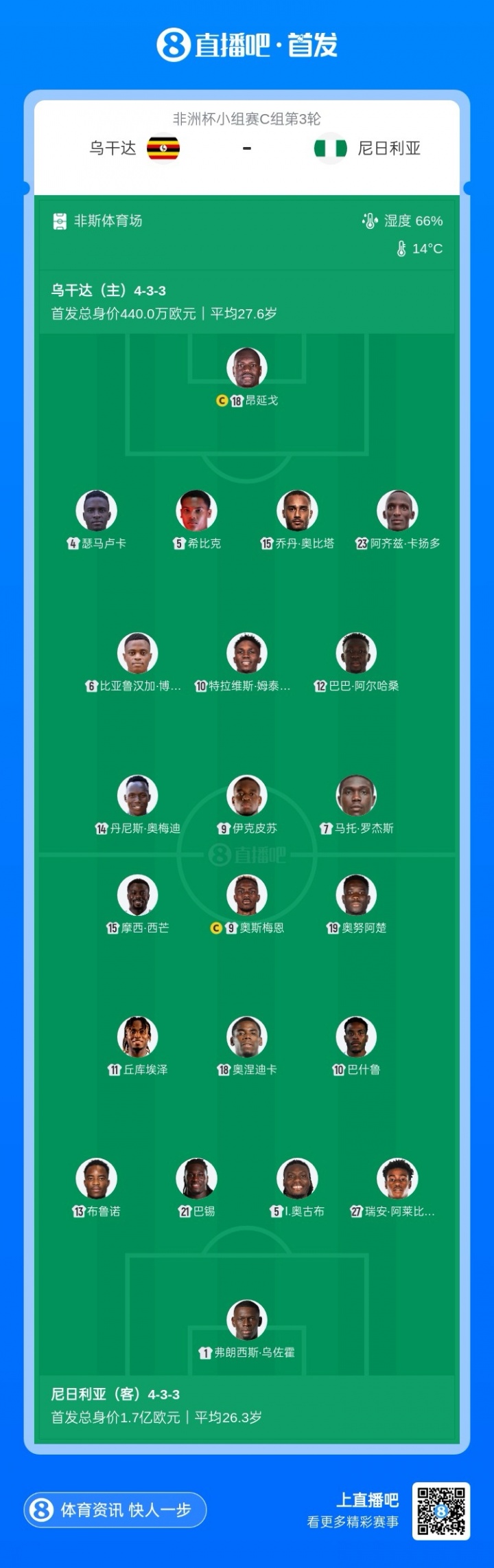 12月30日讯 非洲杯小组赛C组第3轮,乌干达对阵尼日利亚,赛前首发公布。