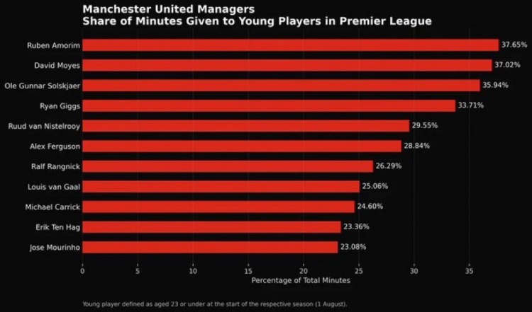 后弗格森时代,阿莫林是让U23球员获得最多出场时间的主教练,占球队总比赛时间的比例达到了37.65%,穆里尼奥时代则最低,仅为23.08%。