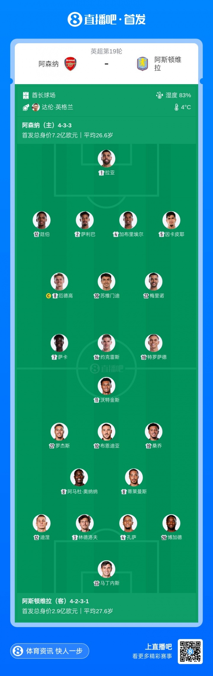 12月31日讯 北京时间12月31日4:15,英超第19轮,阿森纳vs阿斯顿维拉。赛前双方公布了本场比赛的首发名单。【阿森纳方面,赖斯因膝盖伤情缺战,上场伤缺的廷伯复出,本·怀特和哈弗茨也伤愈复出替补待命;维拉方面罗杰斯先发,博加德客串右后卫。】
