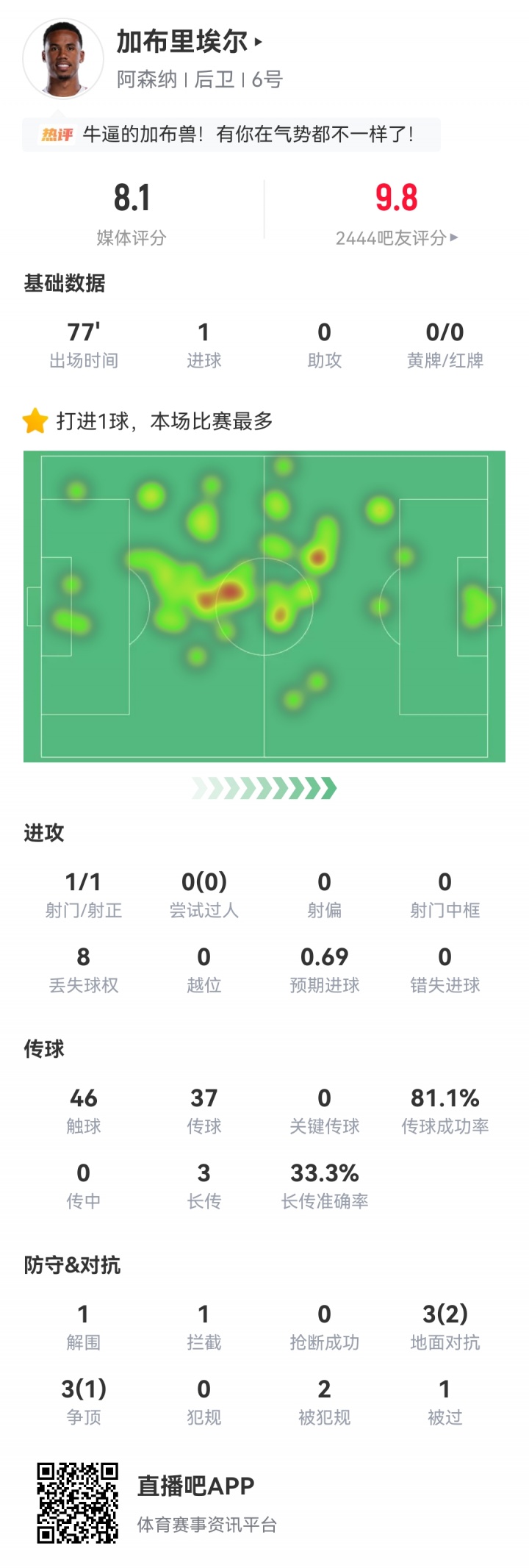 此役阿森纳中卫加布里埃尔再次展现出极高的竞技水平和状态,在进攻端(首开记录的进球)、防守端都有上佳表现。