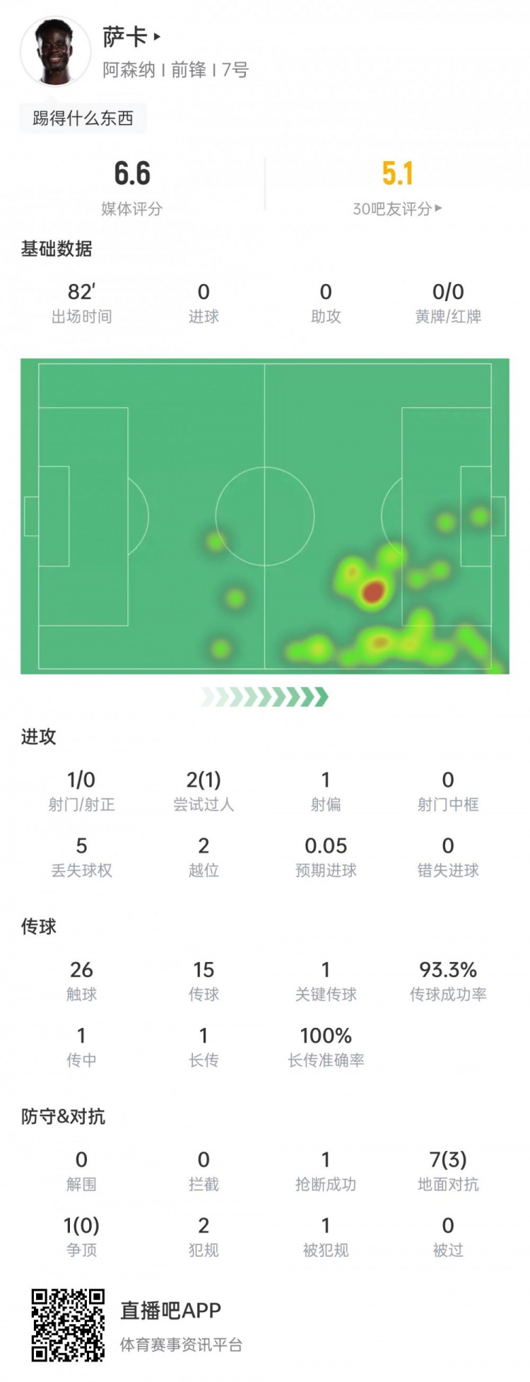 12月31日讯 英超第19轮比赛,萨卡第83分钟被换下,阿森纳4-0领先维拉。