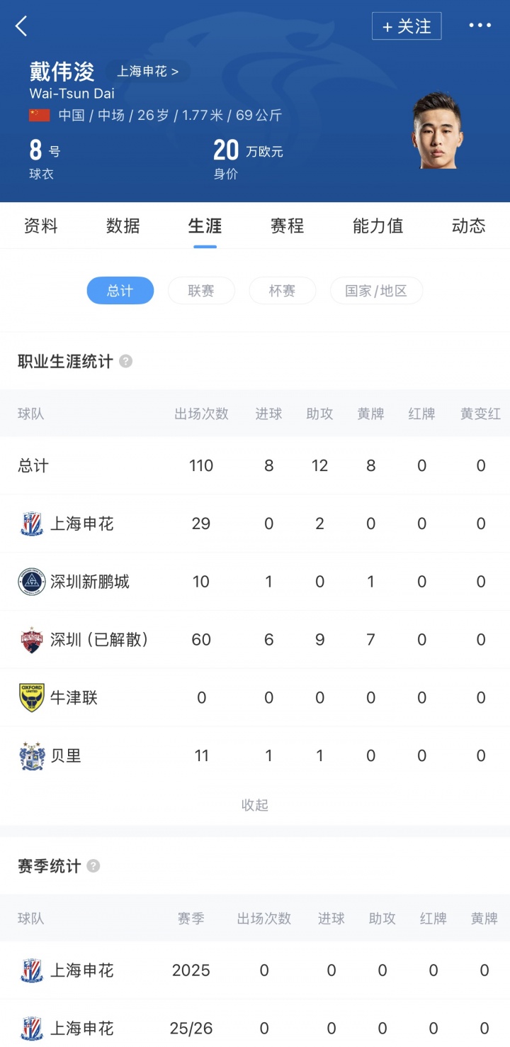 直播吧:26岁申花中场戴伟浚基本确定加盟深圳新鹏城
