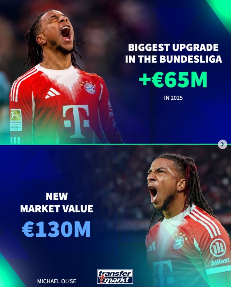 12月31日讯 2025年即将结束,《转会市场》也统计了五大联赛各自的年度身价上涨最多球员,奥利塞+6500万最多。
