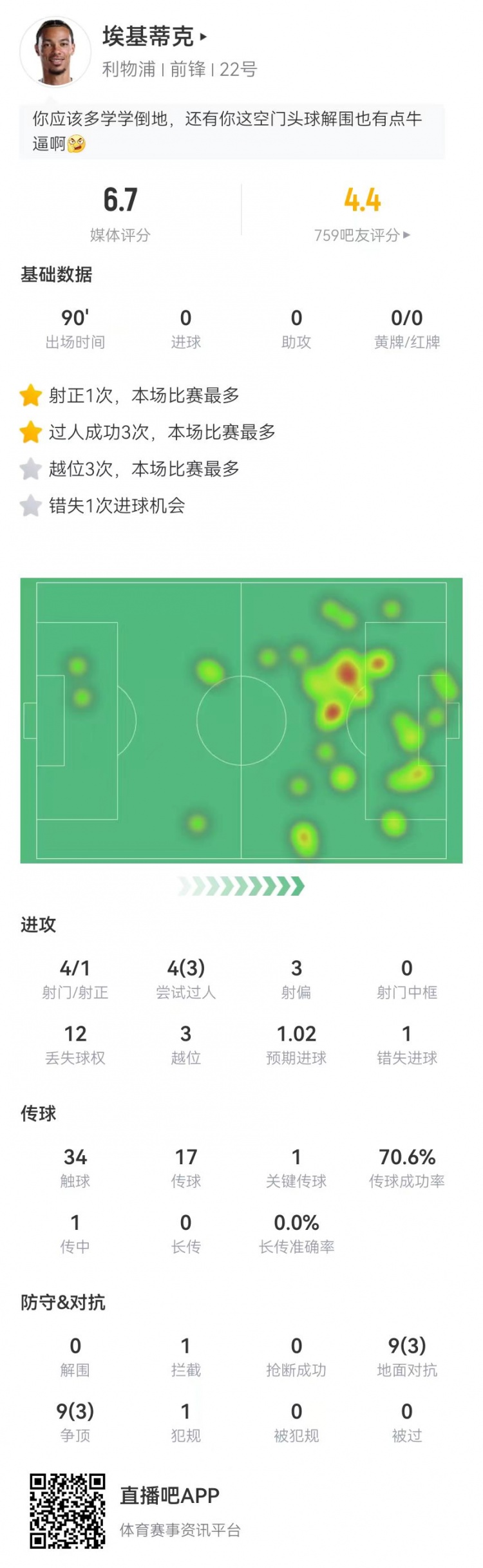 1月2日讯 利物浦在本轮英超0-0战平利兹联,埃基蒂克本场数据如下: