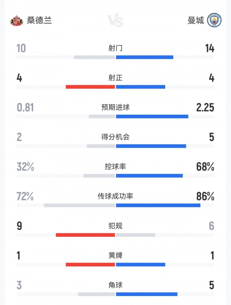 系统局!曼城0-0桑德兰:曼城14射4正,预期进球2.25得分机会5-2