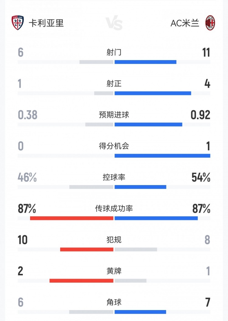 1月3日讯 本轮意甲,米兰1-0客胜卡利亚里。双方全场重点数据对比如下↓(主队卡利亚里在前)