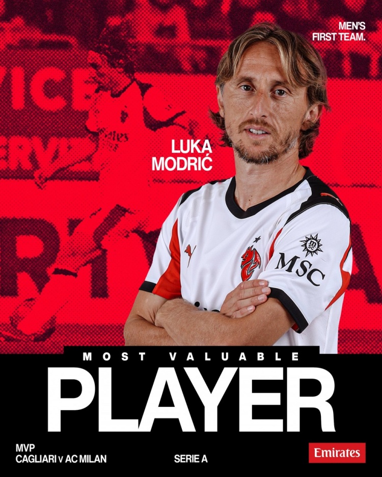 1月3日讯 意甲第18轮,AC米兰客场1比0力克卡利亚里。AC米兰官方宣布,凭借大师级的表现,莫德里奇当选本场比赛的最佳球员。