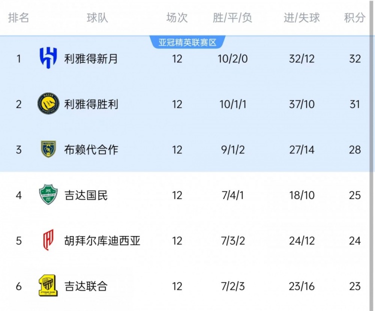 沙特联赛积分榜前六名