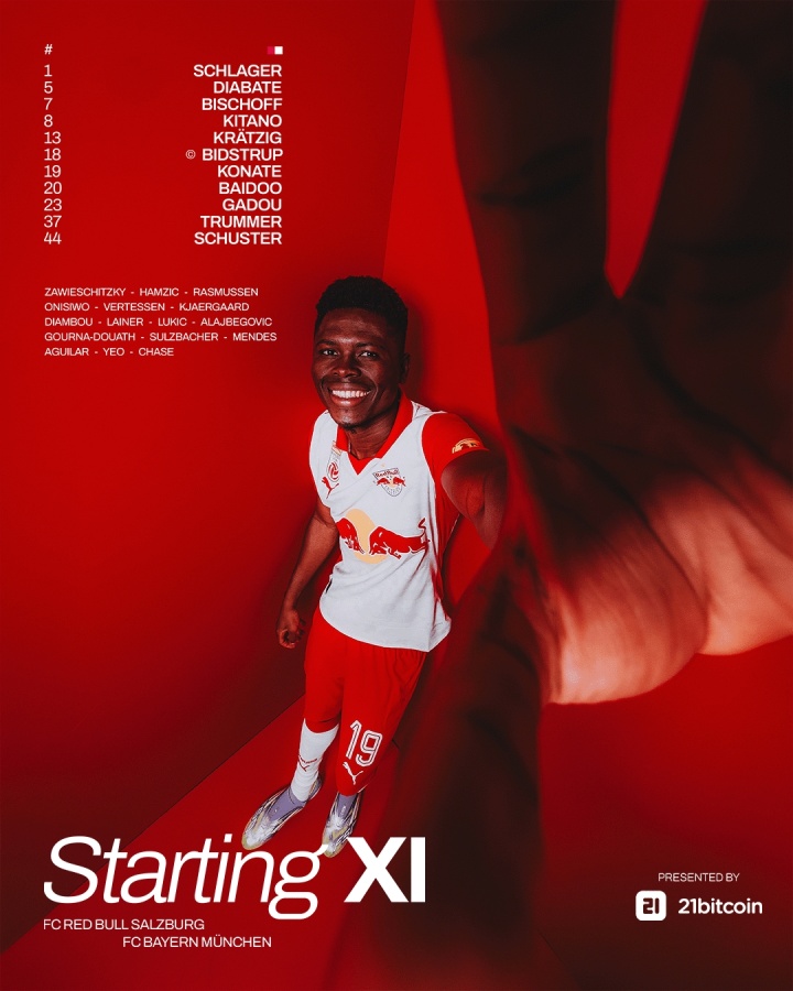 萨尔茨堡红牛首发:1-施拉格、37-特鲁默、23-加杜、44-舒斯特、13-克雷茨格、5-迪亚巴特、18-比斯特鲁普、20-拜杜、8-北野飒太、7-比绍夫、19-科纳特