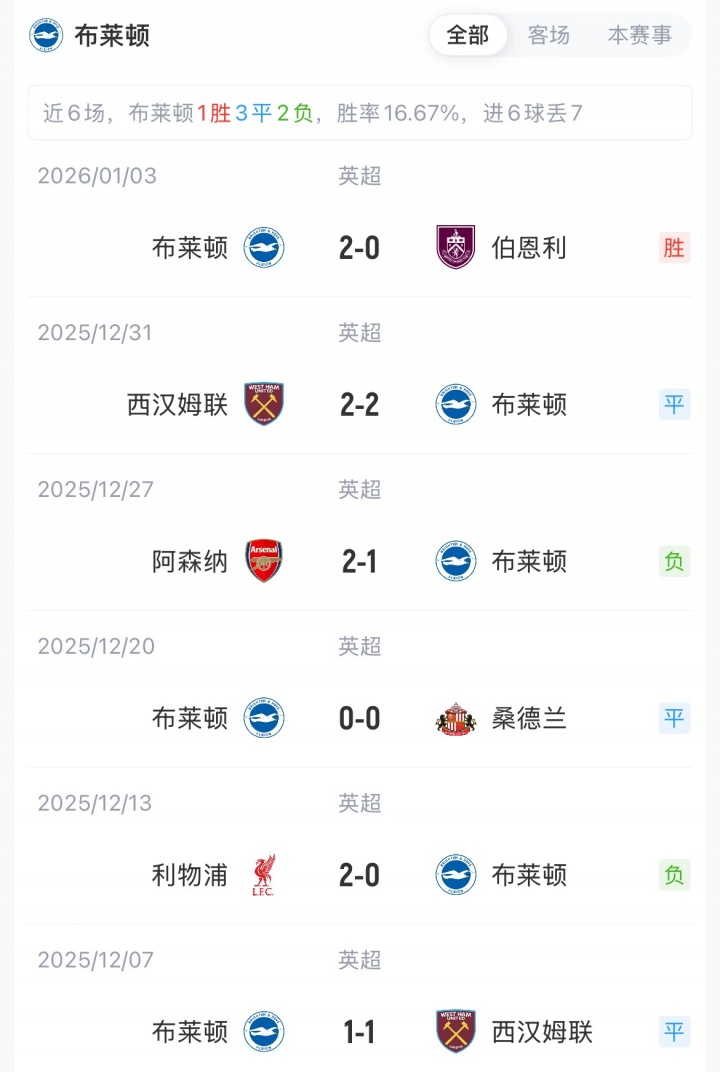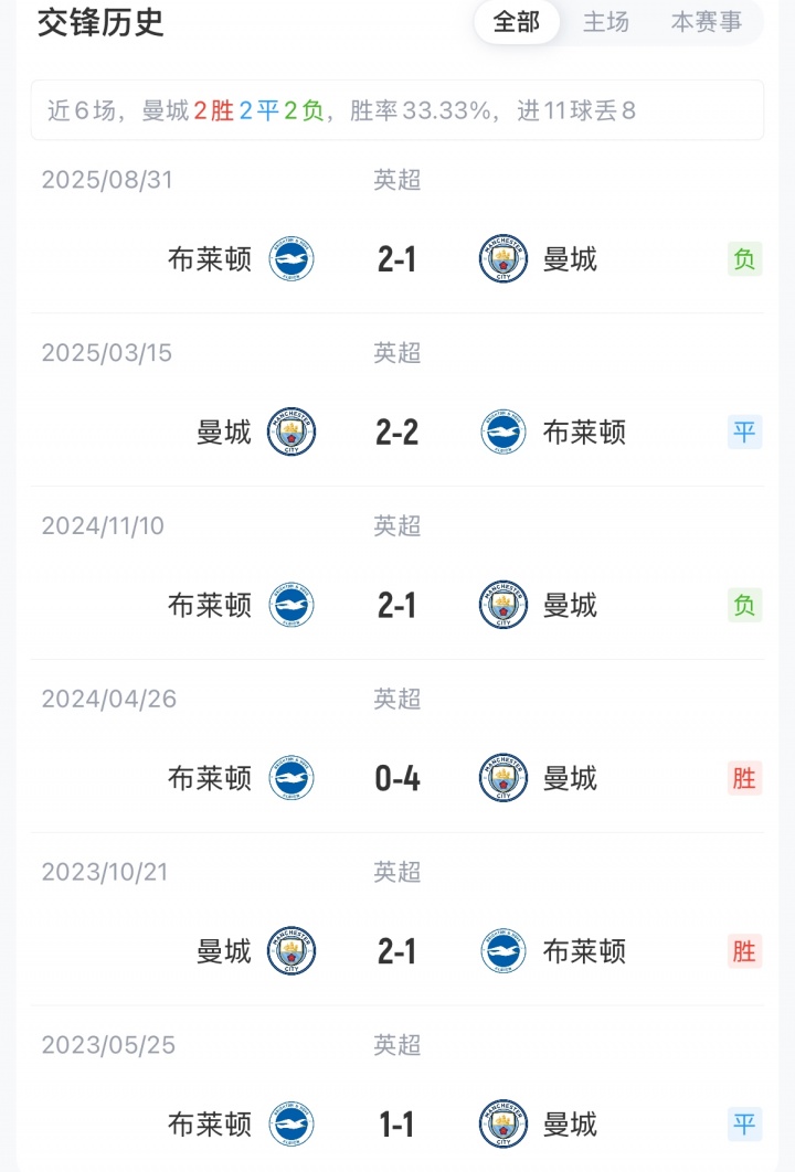 曼城联赛两连平,已落后榜首6分。布莱顿积28分暂排第十。曼城对布莱顿已三场不胜,赛季首次交手客场1-2遭布莱顿绝杀。