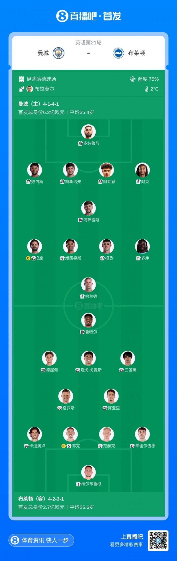 曼城首发:25-多纳鲁马、27-努内斯、45-胡桑诺夫、68-阿莱恩、6-阿克、14-尼科·冈萨雷斯、20-B席、4-赖因德斯、47-福登、11-多库、9-哈兰德