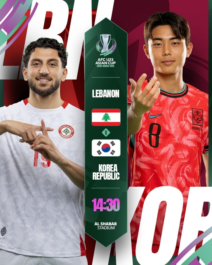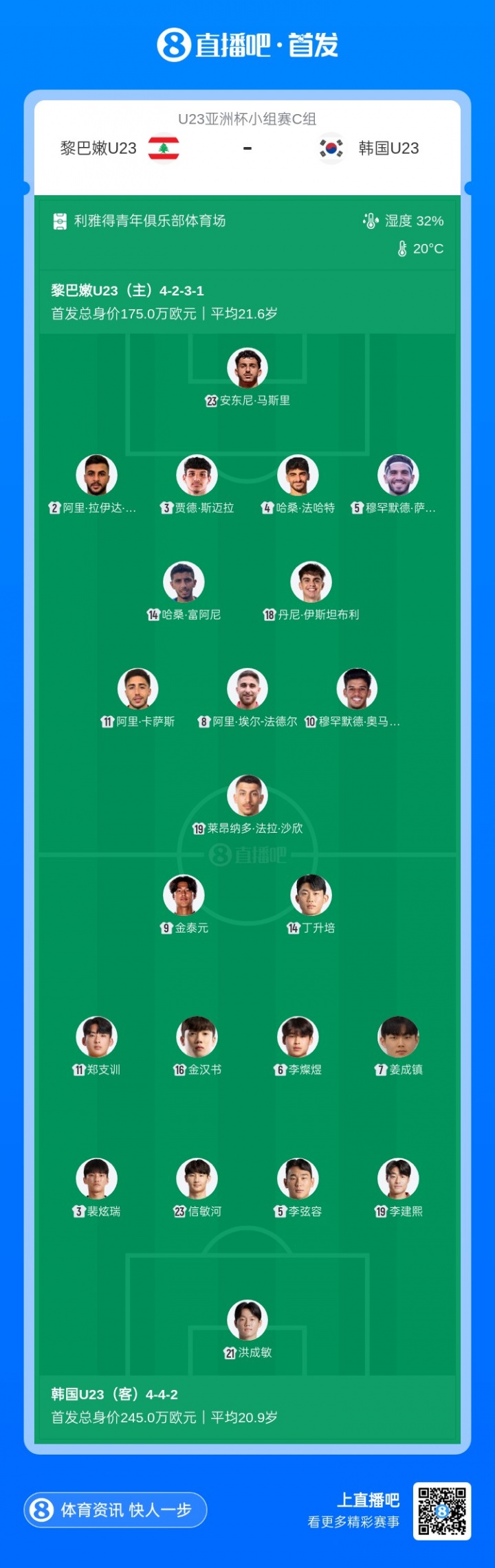 U23亚洲杯-黎巴嫩vs韩国首发出炉:韩国与首轮相比大轮换