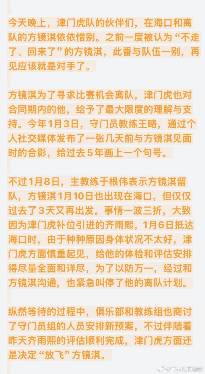 1月13日讯 天津记者顾颖消息,津门虎门将方镜淇已经告别了球队。