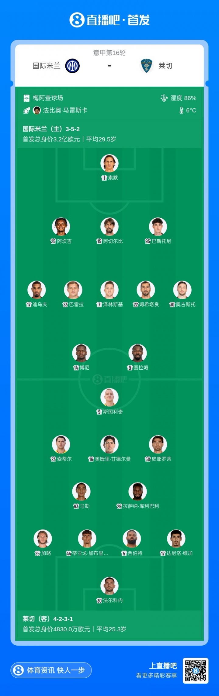 国米vs莱切首发:劳塔罗替补,图拉姆、博尼、迪乌夫先发
