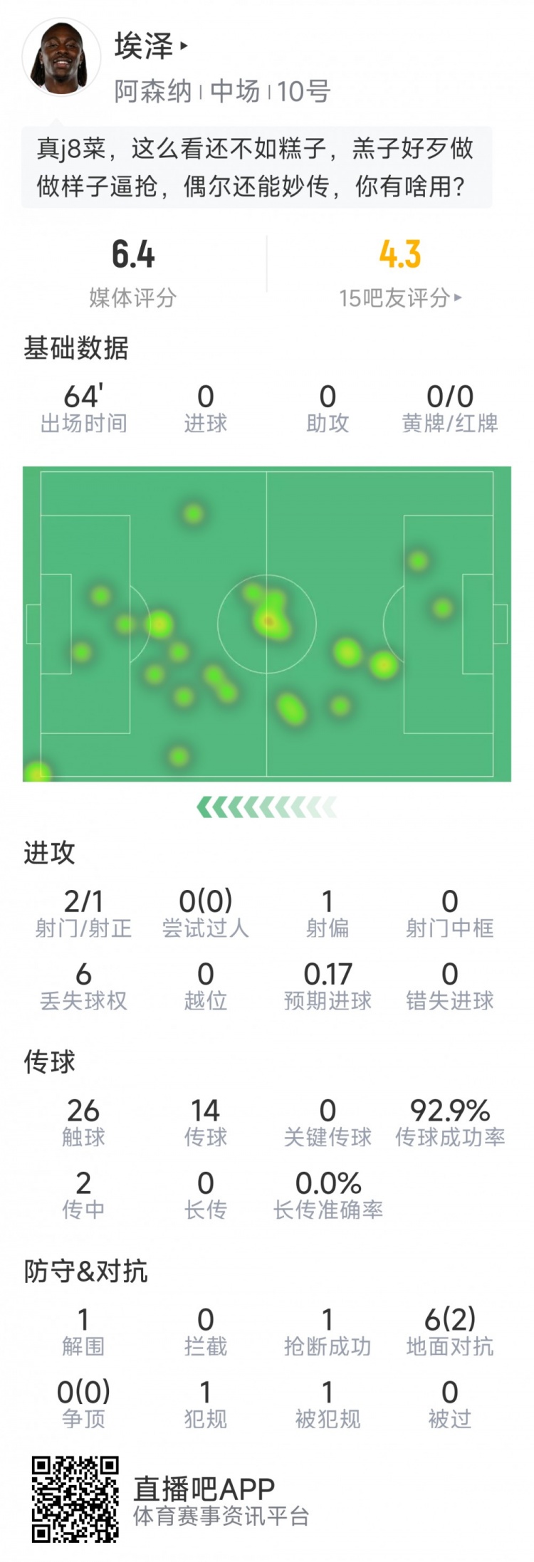 1月21日讯 在本轮欧冠阿森纳对阵国米的比赛中,埃泽首发出场,以下为他在本场数据: