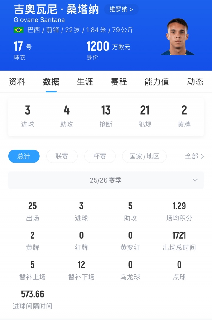 吉奥瓦尼现年22岁,本赛季为球队出场25场,贡献3粒进球和5次助攻,目前其德转身价为1200万欧。