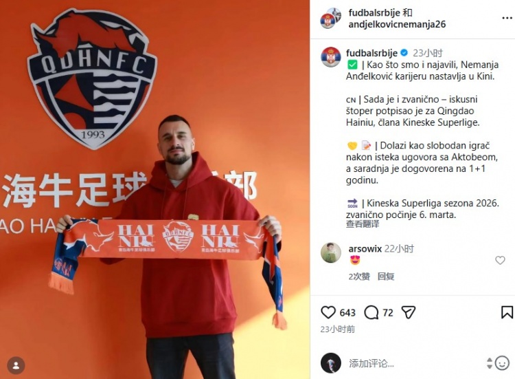 塞尔维亚媒体:安杰尔科维奇与青岛海牛的合同为“1+1”
