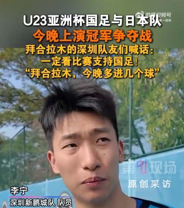 1月24日讯 今晚,U23亚洲杯决赛U23国足将与日本U23队争夺冠军。据“深圳广电集团”报道,赛前,深圳新鹏城队友为拜合拉木加油助威。