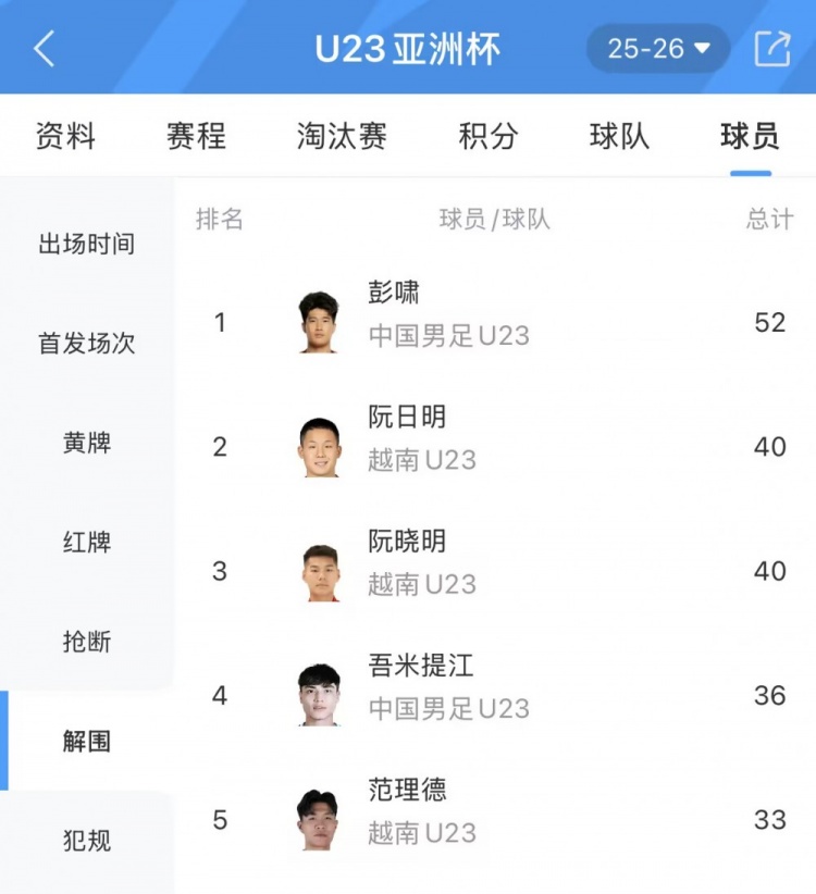 1月24日讯 U23亚洲杯决赛,U23国足将与日本U23队争夺冠军。数据统计方面,U23国足中后卫彭啸贡献了52次解围,排名本届U23亚洲杯解围榜第一。此外,吾米提江贡献36次解围,排名第四。