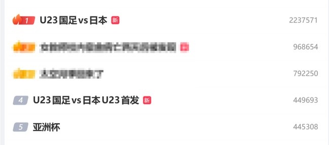 1月24日讯 北京时间今天晚间,中国队与日本队展开U23亚洲杯决赛的较量。本场比赛在国内有着非常高的关注度,比赛刚刚开始时,微博热搜的前5位里已经有3条与本场有关。