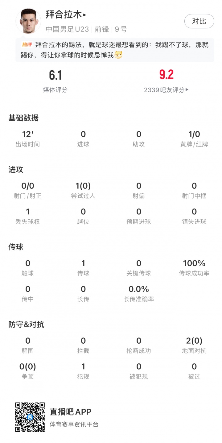本场比赛,拜合拉木替补出场12分钟,1次犯规吃到黄牌。赛后,安东尼奥在发布会上透露,拜合拉木这几天发烧了,发烧到39度。