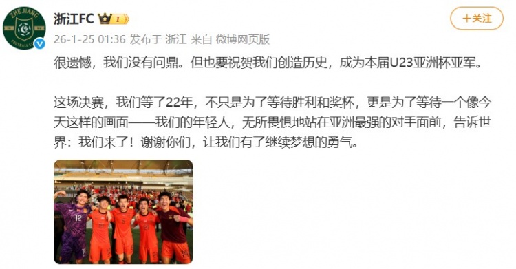 1月25日讯 U23亚洲杯决赛,U23国足0-4不敌日本U23,收获亚军。浙江职业足球俱乐部官方更新动态。