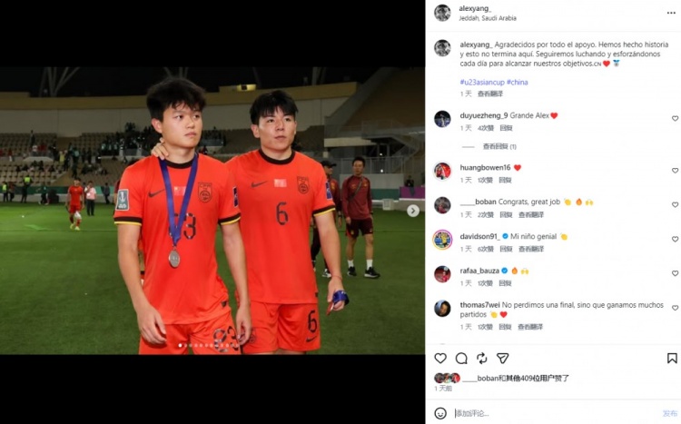 1月28日讯 U23亚洲杯落幕,U23国足获得亚军,创造球队历史最佳战绩。赛后,U23国足球员杨希更新了个人社交媒体。