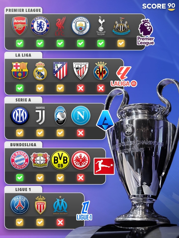 01月29日讯 欧冠联赛阶段落下帷幕,外媒score90统计了五大联赛球队的晋级情况(如上图)。绿色√代表已经晋级欧冠淘汰赛,黄色√代表晋级附加赛。红色×代表已经被淘汰。