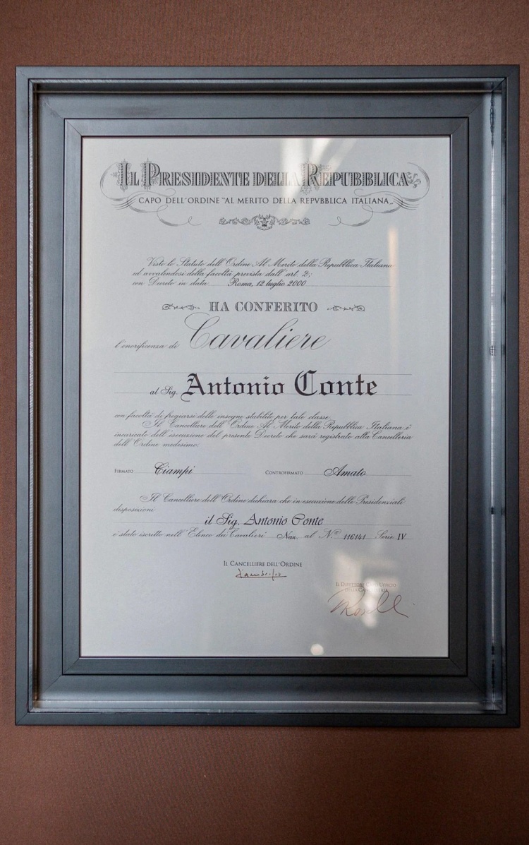 在都灵的孔蒂家中,我们在他的书房聊了三个小时的足球。书房里摆着一张桌上足球台,还有一台辛普森一家主题的弹珠机。之后,孔蒂带着我参观了他的家。墙上挂着一幅装裱好的证书,那是他的意大利共和国功绩骑士勋章。伊丽莎贝塔笑着解释道:“就像埃尔顿·约翰爵士那样的荣誉。”
