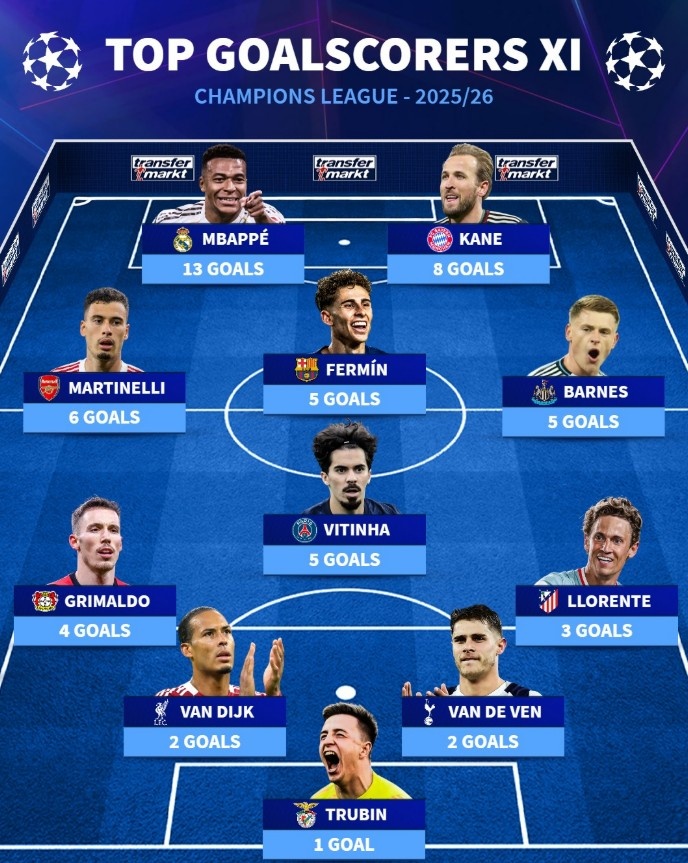 前锋:姆巴佩(皇马,13球)、凯恩(拜仁,8球)