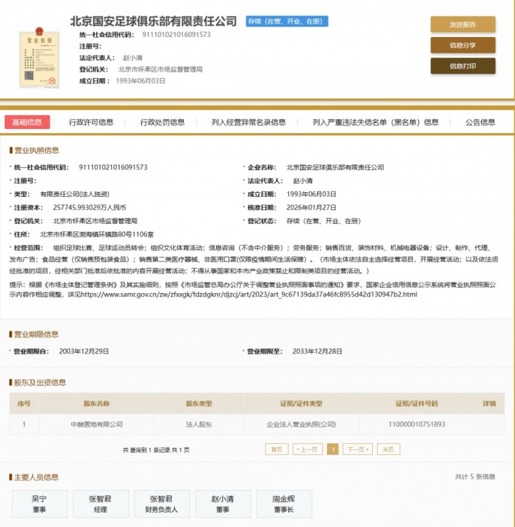 1月30日讯 国家企业信用信息公示系统显示,北京国安足球俱乐部法定代表人已由李明变更为赵小清。