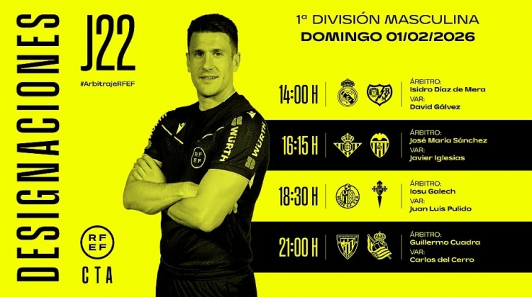 1月31日讯 本周末,西甲联赛第22轮将拉开战幕,西班牙足协官方公布了本轮比赛部分场次的裁判安排,伊西德罗·迪亚斯·德-梅拉执法皇马主场迎战巴列卡诺的比赛。