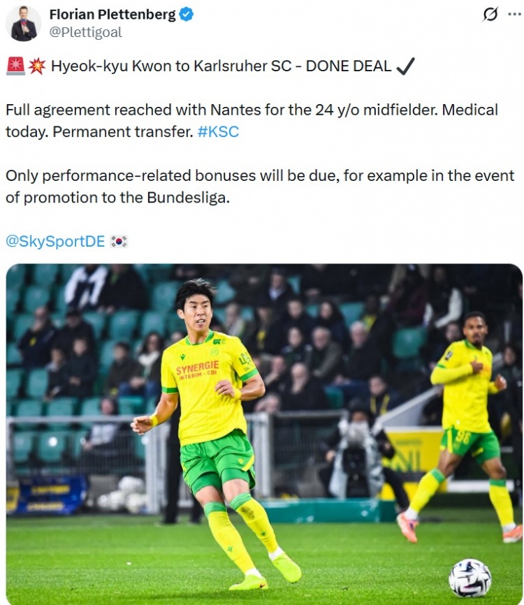 1月31日讯 据德天空记者Florian Plettenberg报道,韩国球员权赫圭转会卡尔斯鲁厄的交易完成。