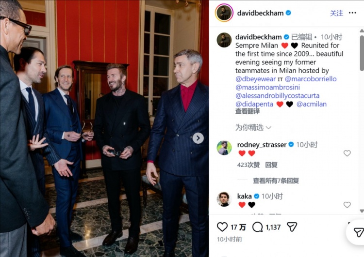 贝克汉姆写道:“永远的米兰。自2009年以来首次重聚……非常美好的夜晚,受Eyewear by David Beckham的邀请,在米兰城见到了我在米兰时期的老队友们。”