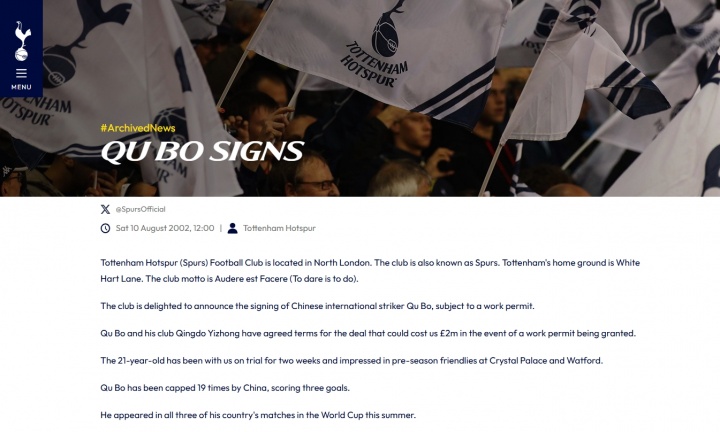 2002年,英国劳工部拒绝颁发劳工证,21岁的“追风少年”曲波登陆热刺失败。
