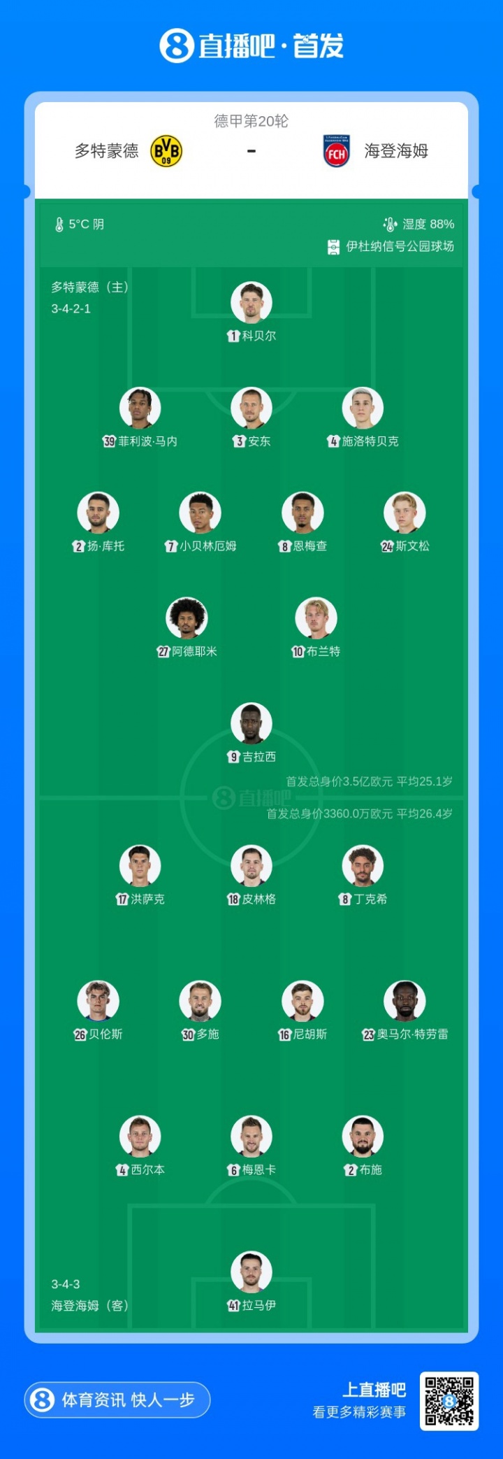 02月01日讯 德甲第20轮,多特蒙德主场迎战海登海姆,赛前首发名单公布。