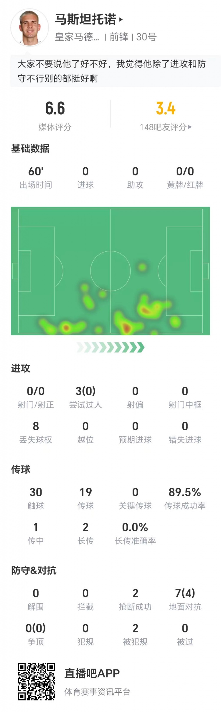 技术统计数据显示,马斯坦托诺本场比赛3射零正,零关键传球,8次丢失球权,两次抢断,7次地面对抗成功4次,获评6.6分。